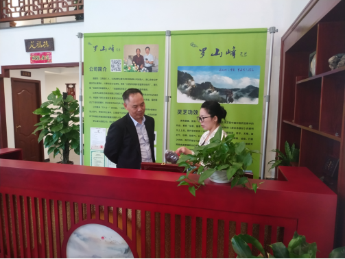 黃有盛一行先后調(diào)研了羅山峰公司崇仁縣靈芝生產(chǎn)基地、展示營銷館。在聽取了陳琴對羅山峰公司經(jīng)營現(xiàn)狀(以土黑靈芝仿生種植為主、食用菌、中草藥種植為輔,基地面積3萬余畝,年產(chǎn)值近億元)、經(jīng)營模式(公司+農(nóng)民合作社+家庭農(nóng)場+農(nóng)戶)、產(chǎn)業(yè)扶貧成效(帶動2個省級貧困村、600余戶農(nóng)民脫貧)等方面的匯報后,黃有盛對羅山峰公司的發(fā)展理念和取得的成效給予肯定。